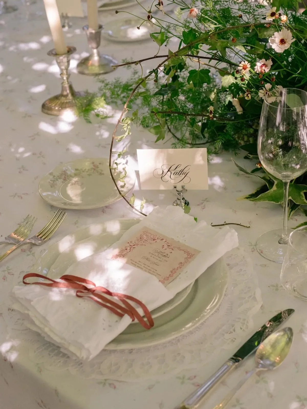 This celebration leaned into layered tabletop styling—an approach that transforms a beautiful setting into an immersive experience. Vintage-inspired details, delicate linens, and thoughtfully mixed pieces created a tablescape that felt like it had been gathered over time rather than rented all at once.